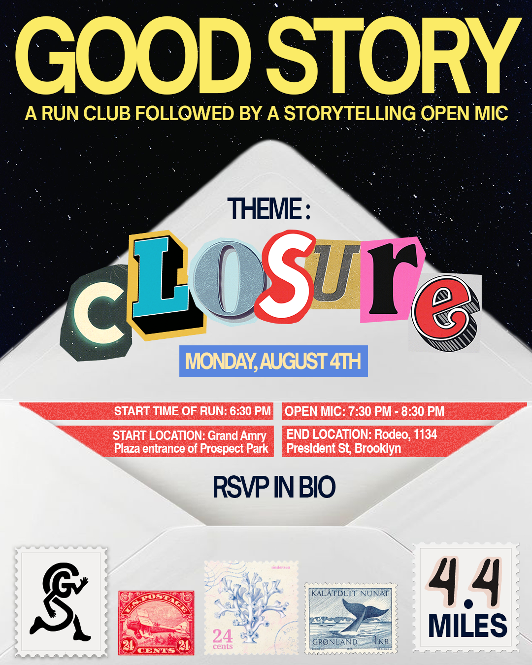 Aug 4 GSRC good story run club vol. 3 Monday, August 4, 2025 6:30 PM 8:30 PM Prospect Park (map) Google Calendar ICS our monthly run + open mic. sign up required <3 View Event →
