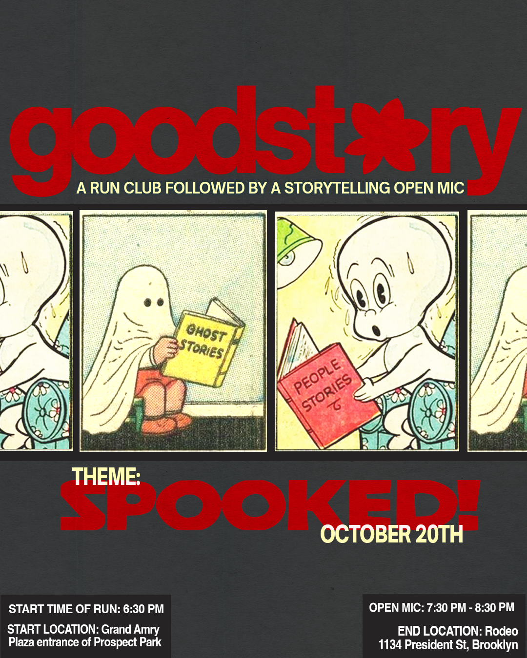 Oct 9 GSRC good story run club x mend. Thursday, October 9, 2025 6:30 PM 8:45 PM 4 Equality Park Pl (map) Google Calendar ICS View Event → Oct 20 GSRC good story run club vol. 5 Monday, October 20, 2025 6:30 PM 8:30 PM Prospect Park (map) Google Calendar ICS our monthly run + open mic. sign up required <3 View Event → Sep 8 GSRC good story run club vol. 4 Monday, September 8, 2025 6:30 PM 7:30 PM Prospect Park (map) Google Calendar ICS our monthly run + open mic. sign up required <3 View Event → Aug 4 GSRC good story run club vol. 3 Monday, August 4, 2025 6:30 PM 8:30 PM Prospect Park (map) Google Calendar ICS our monthly run + open mic. sign up required <3 View Event → Jul 1 GSRC good story run club vol. 2 Tuesday, July 1, 2025 6:30 PM 8:30 PM Prospect Park (map) Google Calendar ICS our monthly run + open mic. sign up required <3 View Event → May 13 GSRC good story run club vol. 1 Tuesday, May 13, 2025 6:30 PM 8:30 PM Prospect Park (map) Google Calendar ICS our monthly run + open mic. sign up required <3 View Event →